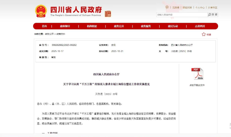 10月21日,四川省人民政府办公厅印发《关于学习运用“千万工程”经验深入推进全域土地综合整治工作的实施意见》(以下简称《实施意见》),旨在充分发挥全域土地综合整治效能,推动城乡融合发展、促进乡村全面振兴与宜居宜业和美乡村建设。《实施意见》为未来几年四川全域土地综合整治提供了清晰的“时间表”和“施工图”。